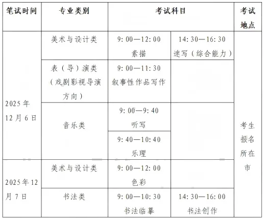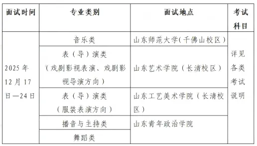 山东省教育招生考试院发布了《山东省2026年普通高等学校招生艺术类专业统一考试公告》,提醒考生2026年艺术类专业统考于2025年12月6日-7日进行笔试,2025年12月17日至24日进行面试。
